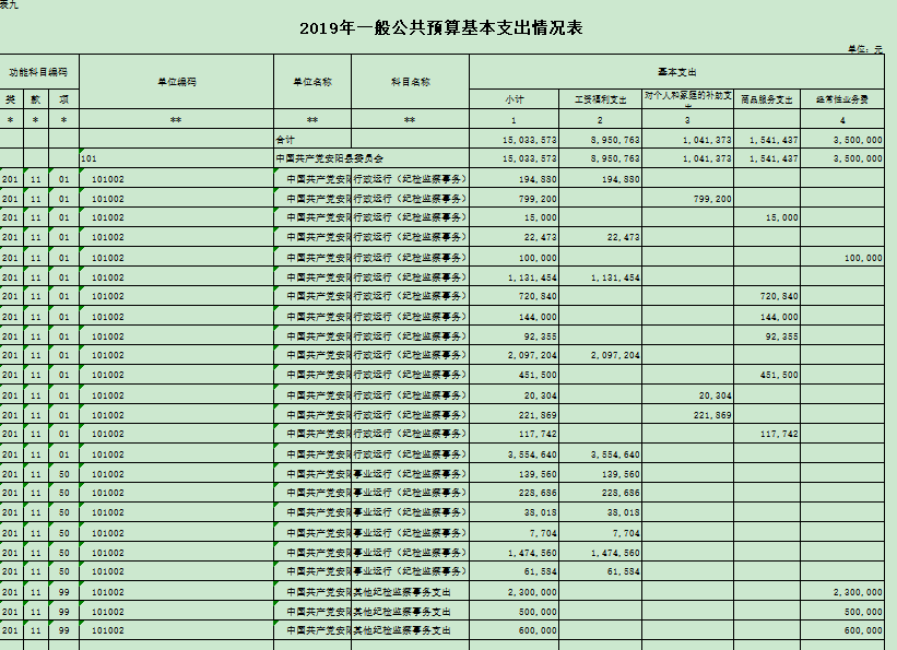 安阳县纪委 201 9 年一般公共预算收支预算 1 503 万元。与 201 8 年相比,一般公共预算收支预算增加 247 万元,增长 19 % ,主要原因:本年 人员工资增加。