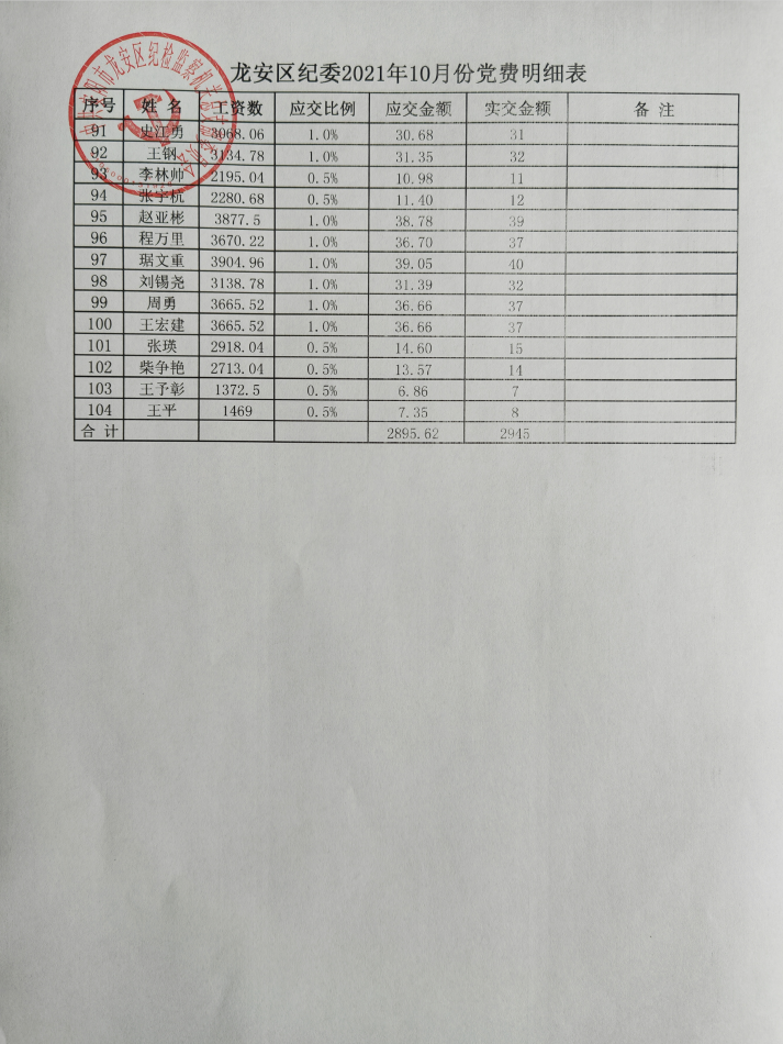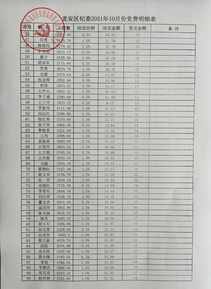 党务公开|龙安区纪委2021年10月党费明细