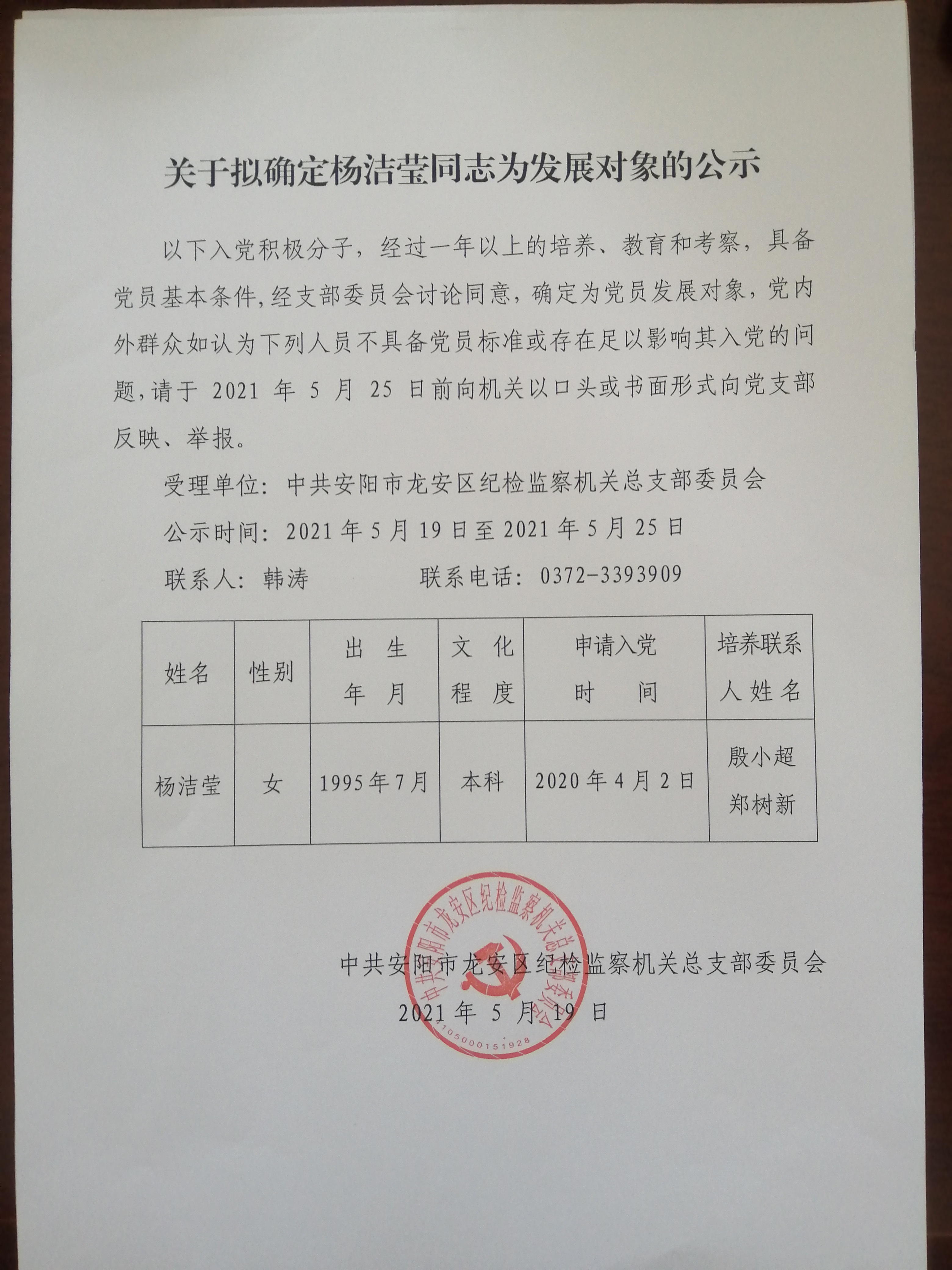 党务公开|关于拟确定杨洁莹同志为发展对象的公示