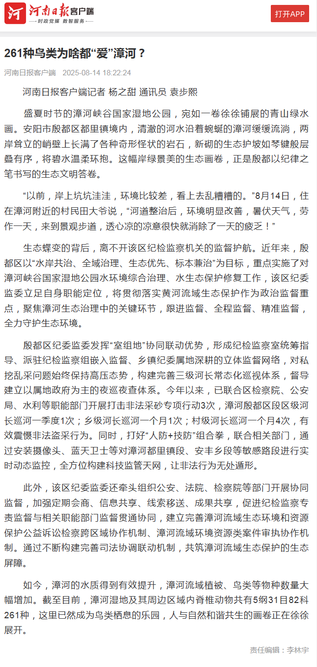 生态蝶变的背后,离不开该区纪检监察机关的监督护航。近年来,殷都区以“水岸共治、全域治理、生态优先、标本兼治”为目标,重点实施了对漳河峡谷国家湿地公园水环境综合治理、水生态保护修复工作,该区纪委监委立足自身职能定位,将贯彻落实黄河流域生态保护作为政治监督重点,聚焦漳河生态治理中的关键环节,跟进监督、全程监督、精准监督,全力守护生态环境。