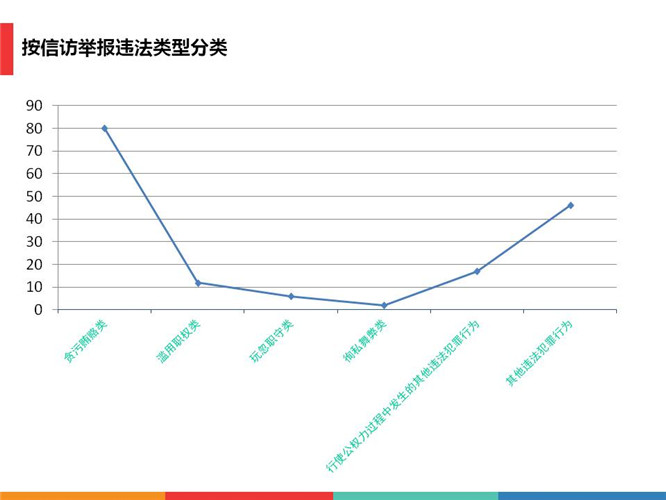 从信访举报违法类型来看,贪污贿赂类行为80件(次),占49.08%;滥用职权类行为12件(次),占7.36%;玩忽职守类行为6件(次),占3.68%;徇私舞弊类行为2件(次),占1.23%;行使公权力过程中发生的其他违法犯罪行为17件(次),占10.43%;其他违法犯罪行为46件(次),占28.22%。
