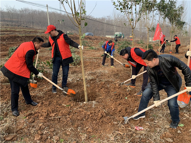 在植树现场,市纪委监委机关的志愿者们三至四人一组,分工合作,有的扶树,有的挖土,有的填埋,每个细节都认真对待,挥锹铲土、扶正定根、填土踩实,一株株树苗很快被栽植完毕。