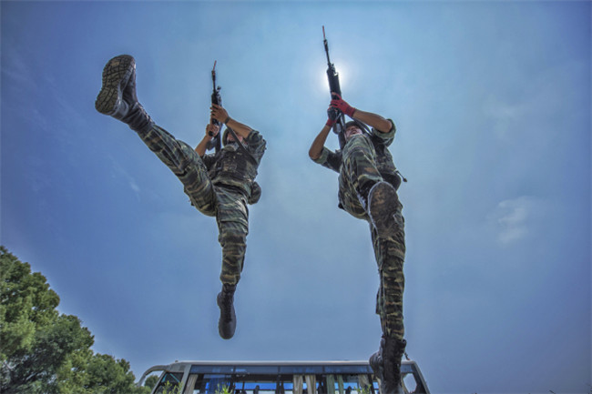 冬练三九,夏练三伏。在武警安徽省总队训练基地,官兵们正在开展“迎八一、战三伏”实战化训练,上演“奇兵突袭”。(安徽省合肥市纪委监委供韩芳摄)