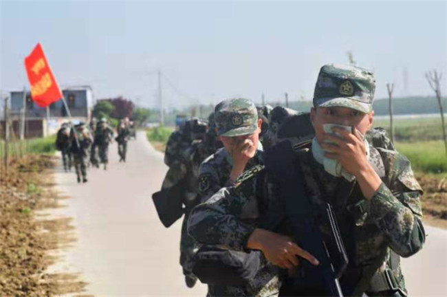 安徽省宿州市军分区组织民兵应急分队进行实战化演练:迅速通过染毒地段。(安徽省宿州市纪委监委供邵子卿摄)