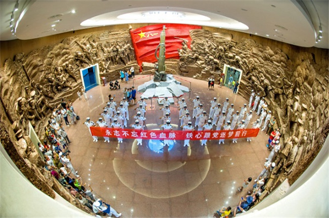 中国人民解放军海军某部官兵在江西南昌八一起义纪念馆进行庆“八一”主题宣誓,重温建军历程。(江西省南昌市纪委监委供丁南昌摄)