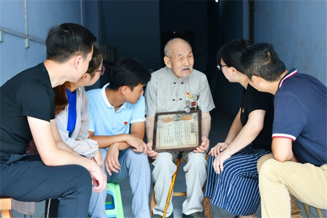河南省郑州市惠济区92岁高龄的二等功臣靳华成,讲述亲身经历的淮海战役、渡江战役、抗美援朝等重大战役战事中的故事,勉励青年人铭记历史、艰苦奋斗。(河南省郑州市纪委监委供郭军斌摄)