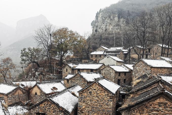 一场小雪“偷袭”云雾缭绕的太行山,冬树翠绿依旧,只让朴拙的房屋白了顶。(焦作市山阳区纪委监委 李诗雅 摄)