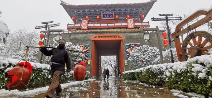 雪花纷飞如柳絮,映衬着庄严典雅的上善门,挑酒的伙计迎面走来,让人嗅到了一抹喧嚣的气息。雪后的清明上河园俨然一幅瑰玮大气、民俗韵味十足的水墨画。(杞县纪委监委 汪少冲 摄)