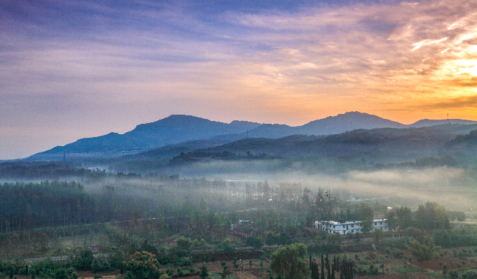 金秋八月,千山初醒,朝云出岫,朝阳似火在云间燃烧,晨雾蒙蒙覆盖林间田野,给远山大地披上轻薄白纱。此刻,世间如此幽静安宁。(洛阳市涧西区纪委监委 段万卿 摄)