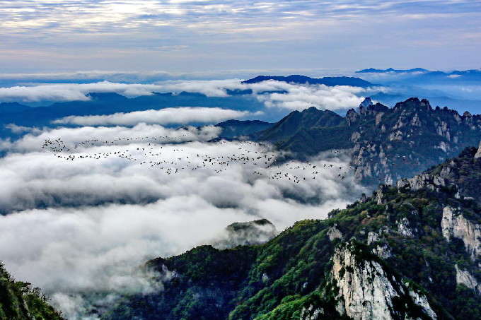 登顶入云海,飞鸟过重峰。八月,连绵起伏的伏牛山脉在翻腾的云海间若隐若现,群鸟、奇峰与云海共同构成一幅壮美的生态画卷。(洛阳市老城区纪委监委 焦涤 摄)