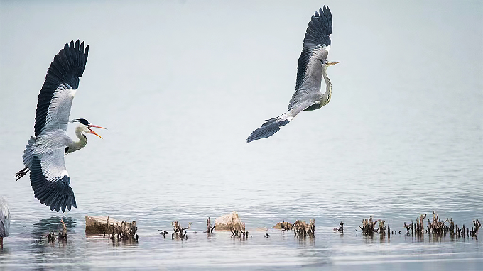 “只余鸥鹭无拘管,北去南来自在飞。”八月新雨初歇,初秋空气清爽、湖水澄净,苍鹭低飞,追逐嬉戏,好不欢快。(焦作市山阳区纪委监委 马海芳 摄)