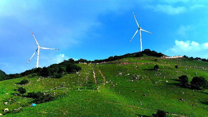 初秋的冠云山,蓝天如洗,绿草如坪,风车静静矗立。游人呼朋引伴于山间小路漫步,沉浸在油画般的迷人秋色里。(灵宝市纪委监委 李强 摄)