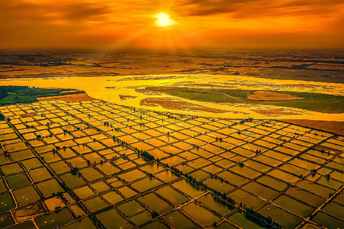 黄河河滩中万亩鱼塘在夕阳下闪动着粼粼波光,沿水塘间长长的林荫道行走,一股湿润清新的水汽,迎面扑来,透着丝丝凉意。(新密市纪委监委 朱留波 摄)