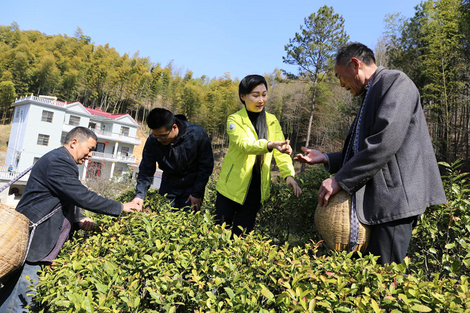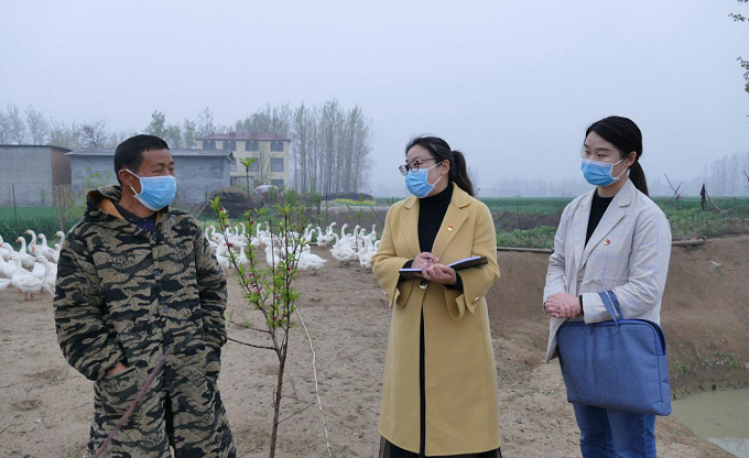 固始县纪委监委加强对巩固“四个不摘”政策成果的监督检查,推动脱贫攻坚成果同乡村振兴有效衔接。图为3月4日,派驻第十三纪检监察组组长郑贵月在武庙集镇脱贫茶农承包的茶场走访。(固始县纪委监委 崔亚苹 摄)