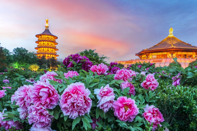 倾城好颜色,花开洛阳城。四月的洛阳是牡丹的天下,雍容华贵的硕大花朵和绿意盈盈的繁密枝叶,为古都洛阳披上了一层华美无极的锦缎。暮色中,千姿百态的牡丹与绚烂无比晚霞腾飞共舞,演绎着暮春盛景。(洛阳市涧西区纪委监委 段万卿 摄)