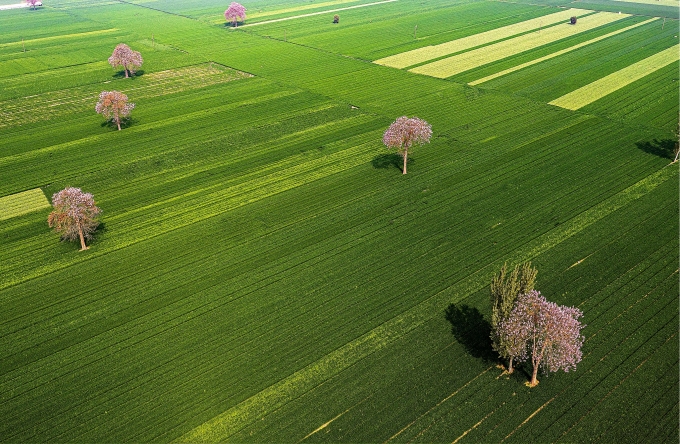 树泛新绿春满园。四月的田野,麦田抽出了绿色的嫩芽,葱葱茏茏,欣欣向荣,充满无限生机与活力。(新密市纪委监委 朱留波 摄)