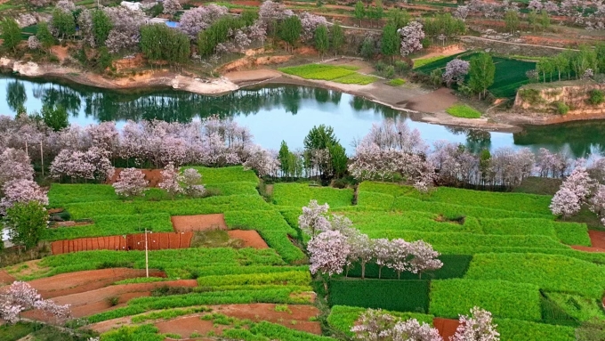 人间四月天,春光无限好。满树繁花,粉黛如霞,麦田青翠,层层叠叠,河流清澈,澄碧如镜,犹如一幅世外桃源画卷,让人流连忘返。(禹州市纪委监委 刘海洋 摄)