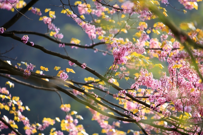 四月,西峡县伏牛山区十几万亩紫荆花次第开放,粉红色的花映衬在绿树丛中,构成一幅绚丽多彩的画卷,蔚为壮观,春风吹来,紫荆花摇曳多姿,阳光照在花瓣上,如梦如幻,宛如人间仙境。(西峡县纪委监委 李晋 摄)