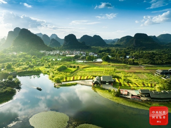 广西壮族自治区阳朔县山村湖畔田色如锦、屋舍俨然。波光潋滟里,轻舟漾起阵阵涟漪。不知不觉间,秋风已将浓绿的田野涂抹得五彩斑斓,一阵阵稻香沁入心脾,又是一年好“丰”景。(广西壮族自治区阳朔县纪委监委供 夏立慧 摄)