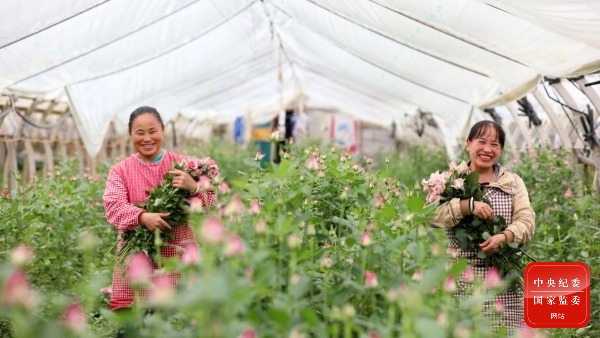 在云南省曲靖市马龙区月望乡玫瑰花种植基地,绿叶间朵朵玫瑰竞相绽放、香气四溢,花农们忙着采摘,喜笑颜开。(云南省曲靖市马龙区纪委监委供 张玉玲 摄)