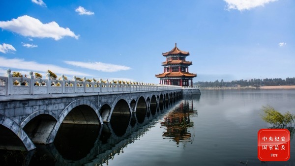 处暑风微凉,藏墅好时光。山东省泰山天颐湖花海景区的天颐阁与湖面交相辉映,水天一色,别有一番诗意。(山东省泰安市岱岳区纪委监委供 郭振敏 摄)