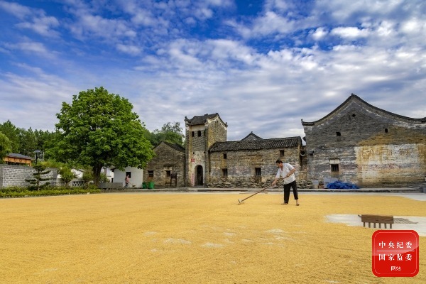 处暑满地黄,家家修廪仓。南方处暑后逐渐进入丰收的季节。在广东省连州市东陂镇,村民在门楼前晒稻谷,天空蔚蓝、满地金黄,构成一幅乡村振兴丰收图景。(广东省连州市纪委监委供 罗敏 摄)