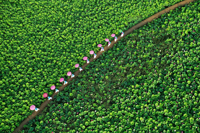 盛夏七月,满池荷花亭亭玉立,娇羞潋滟,荷叶茂密,层层叠叠,少女盛装漫步其中,构成夏日一道靓丽风景线,奏出一曲“荷塘乐色”。(孟州市纪委监委 乔焱明 摄)