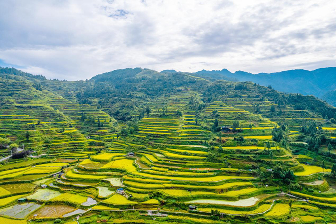 阳光透过云层照耀在层层叠叠的梯田上,碧翠尽染,从远处听见虫鸟齐鸣,呈现出一片生机盎然的景象。(郑州市金水区纪委监委 卫见华 摄)
