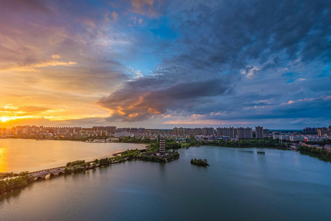 夏日傍晚,柘城县容湖上,晚霞与湖面完美地融为一体,如诗如画的美景让人流连忘返。(柘城县纪委监委 张书珲 摄)