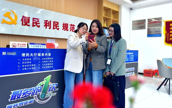 灵宝市纪委监委组织纪检监察干部深入基层,对微信工作群、政务APP等进行清查,持续为基层减负松绑。图为该市纪检监察干部到涧西区西华社区便民大厅了解相关情况。(灵宝市纪委监委 杨蓓蓓 摄)