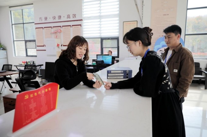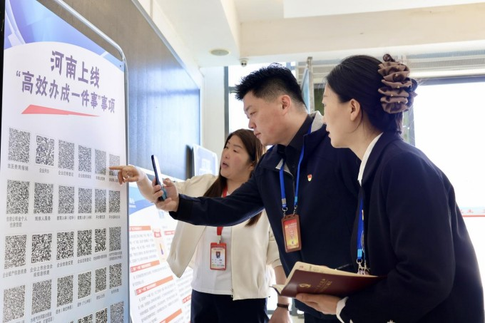 舞钢市纪委监委持续深化整治形式主义为基层减负,从严整治冗余APP、过度留痕、重复报表等问题,以有力监督推动基层减负措施落到实处。图为该市纪检监察干部在行政审批服务中心“高效办成一件事”窗口,实地了解政务服务线上办理情况。(舞钢市纪委监委 毛永慧 摄)