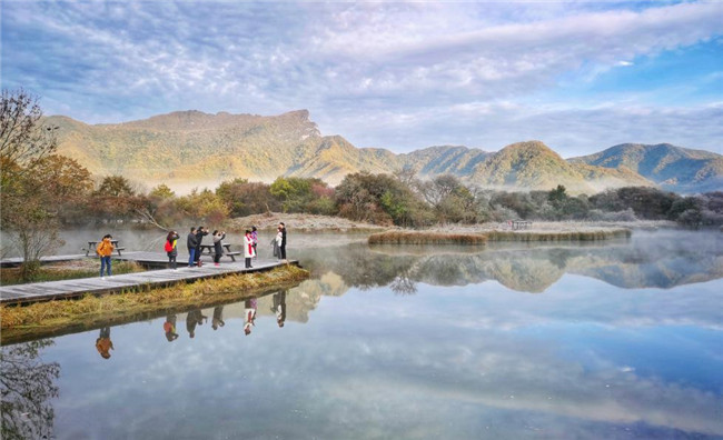 金黄色的芦苇在晨露的笼罩下仿佛拂上了面纱,晨雾萦绕在半山腰上,倒影在清冷的湖水中成为绝妙的美景。(摄影:谢鹏飞)