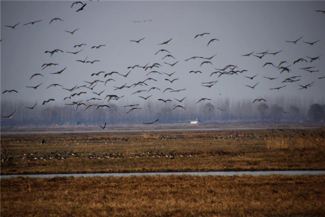 小雪时节,宿鸭湖湿地保护区数万只大雁在湿地上空翱翔,场面十分壮观。随着宿鸭湖生态环境的持续改善,这里成了中原最美的候鸟越冬栖息地。(摄影:侯喜才)
