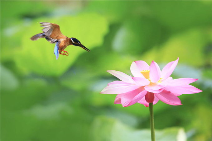 夏至前后,在封丘县陈桥湿地,密密层层的荷叶铺展开来,在无边无际的绿色中,一株红色的荷花绽蕾盛开,亭亭玉立的荷花引来全球性濒危鸟类震旦鸦雀驻足歇脚。(封丘县纪委监委孟庆军摄)
