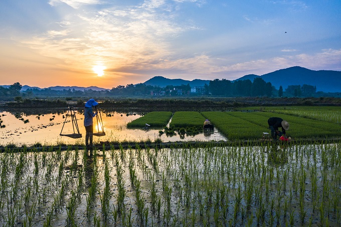 夏至农忙喜落日,余晖插秧正当时。在河南信阳地区,农人趁着落日余晖和难得的清凉抓紧时间栽种水稻,用汗水描绘辛勤劳动的画卷。(潢川县纪委监委胡广才摄)