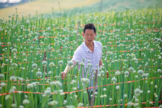 夏至,正是大葱开花的时节,济源示范区大峪镇反头岭村村民正在田间忙活着,期待着即将到来的丰收。(济源示范区纪工委监察工委李元元摄)