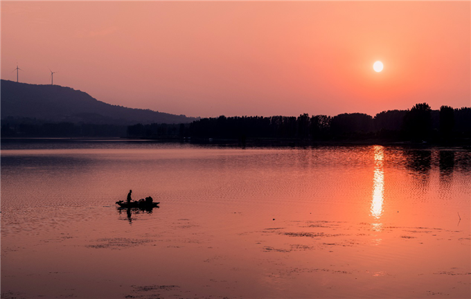 盛夏傍晚,夕阳映照下的水面波光粼粼,渔夫泛舟划过的渔船点缀其中,与远处群山构成了和谐的画卷。(襄城县纪委监委魏永涛摄)