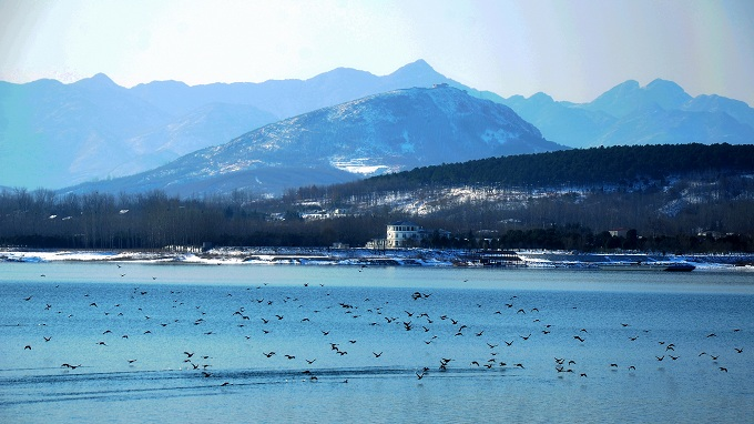 雪后初晴风清气朗,远山覆素、近水如鉴,龙泉湖畔地暖风柔,群鸟翩跹而至,在澄澈湖面嬉戏流连,为素净冬景平添几分灵动生机。(舞钢市纪委监委供 马作鹏 摄)