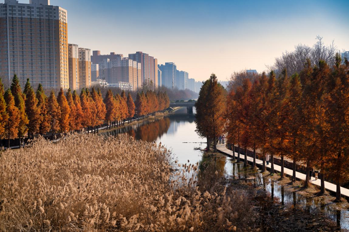 冬日暖阳下,水杉林身披金红盛装,挺拔枝干错落成景。树影倒映在静谧的水面上,光影交织、色彩斑斓,绘就一幅灵动秀美的冬日生态画卷,尽显冬日中原大地之美。(郑州市上街区纪委监委 韦耀星 摄)