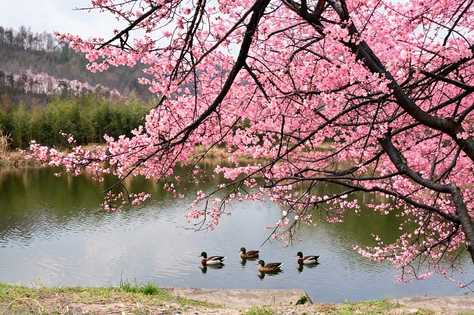 惊蛰水暖,早樱初绽,群鸭拨动一池春,唤醒人间好时节。(商城县纪委监委 李文勇 摄)