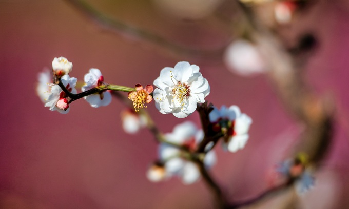 大地回春,虬曲的梅枝间,一朵朵白梅悄然绽放,花瓣舒展、蕊丝清晰,尽显花木复苏的勃勃生机。(郑州市上街区纪委监委 韦耀星 摄)