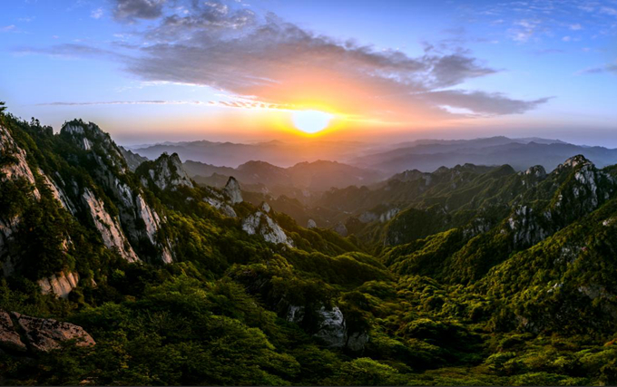 时值大暑,天气愈发清朗,在清晨立于尧山之上,只见朝阳如金色的眼眸探出薄云,为群山披上明亮的霞衣,令人心旷神怡。(鲁山县纪委监委 郭东伟 摄)