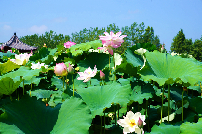 暑气腾升似鼎汤,鹿邑县上清湖池塘里一朵朵荷花从层层叠叠荷叶中探出头来,亭亭玉立,伫立水中,迎风铺面时,为炎炎夏日带来了一缕馨香。(鹿邑县纪委监委 郭磊 摄)