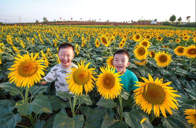 大暑至,万物荣华。洛阳市宜阳县盐镇乡南洼村种植的油葵花竞相开放,金黄的葵花与孩子幸福的笑脸相映生辉。(洛阳市涧西区纪委监委 段万卿 摄)