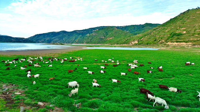 蓝天白云,碧波荡漾。大暑来临,灵宝市南部山区,绿草如坪,羊儿感觉到河边的凉气,欢快地跑到河边吃草,绘成一幅喜人的夏日牧羊图。(灵宝市纪委监委 王东东 摄)