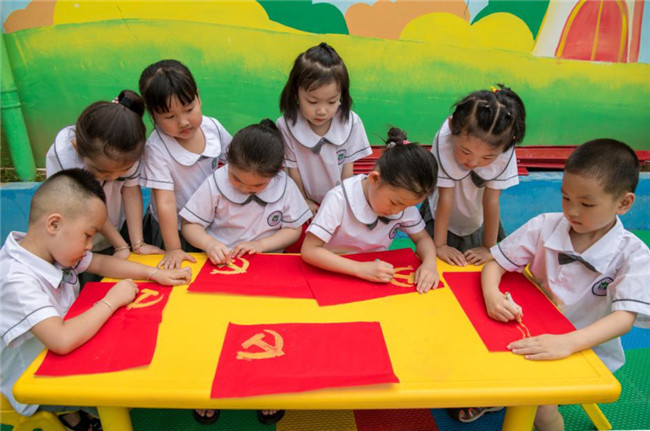 为喜迎建党98周年,鲁山县伟才幼儿园开展了“画笔汇党旗,童心爱祖国”主题活动,从小培养孩子们爱党爱国意识。(摄影:杨朝辉)