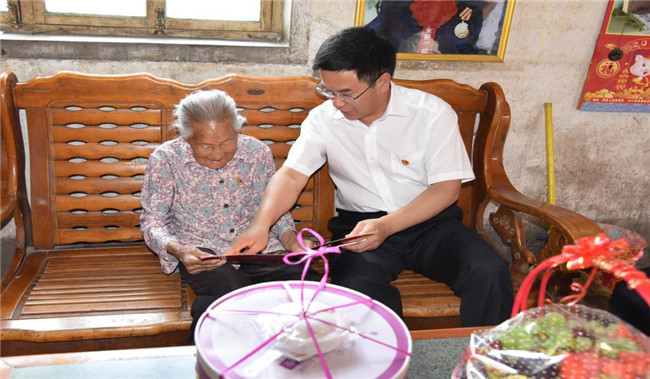“七一”前夕,淇县党员领导干部看望96岁的老党员、全国劳动模范——靳月英,为她送上生日蛋糕、佩戴党员徽章,号召全县党员干部学习劳模精神。(摄影:杨亚昆)