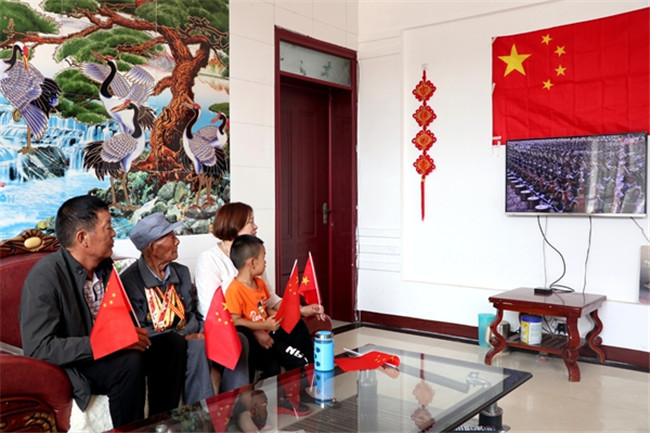鹿邑县玄武镇王桥行政村95岁抗战老兵王荣胸挂勋章,一家三代围坐一起共同观看庆祝中华人民共和国成立70周年大会盛况直播。(摄影:李乐乐)