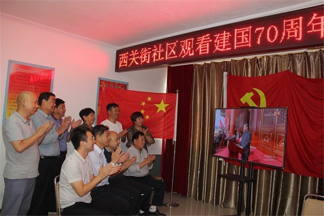 郏县龙山街道纪工委干部到西关街道社区,同“三委”党员干部一起观看中华人民共和国成立70周年庆典。“当国歌奏响、国旗升起时,我激动地热泪盈眶,国富才能民强,国泰才能民安,衷心祝愿祖国母亲越来越好、越来越美、越来越强。”西关街道社区党支部书记艾宗付表示。(摄影:王翠玉)