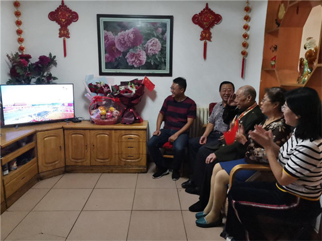 洛阳市离休老干部聚精会神地观看阅兵直播,看着气势恢宏的场景,老干部激动地敬了一个军礼,向人民军队致敬,向伟大的祖国致敬。(摄影:张颖)